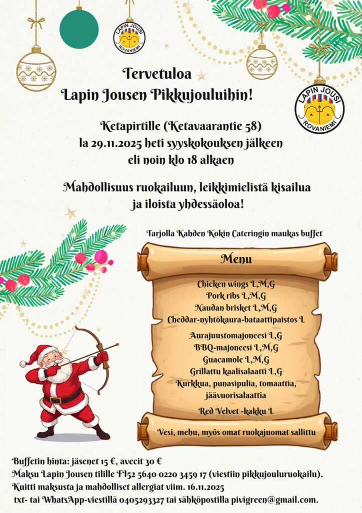Lapin Jousi ry:n sääntömääräinen syyskokous järjestetään Lauantaina 29.11.2025 klo 17.00 Ketapirtillä osoitteessa Ketavaarantie 58. Heti syyskokouksen jälkeen vaihdetaan vaihde vapaalle pikkujoulujen merkeissä!